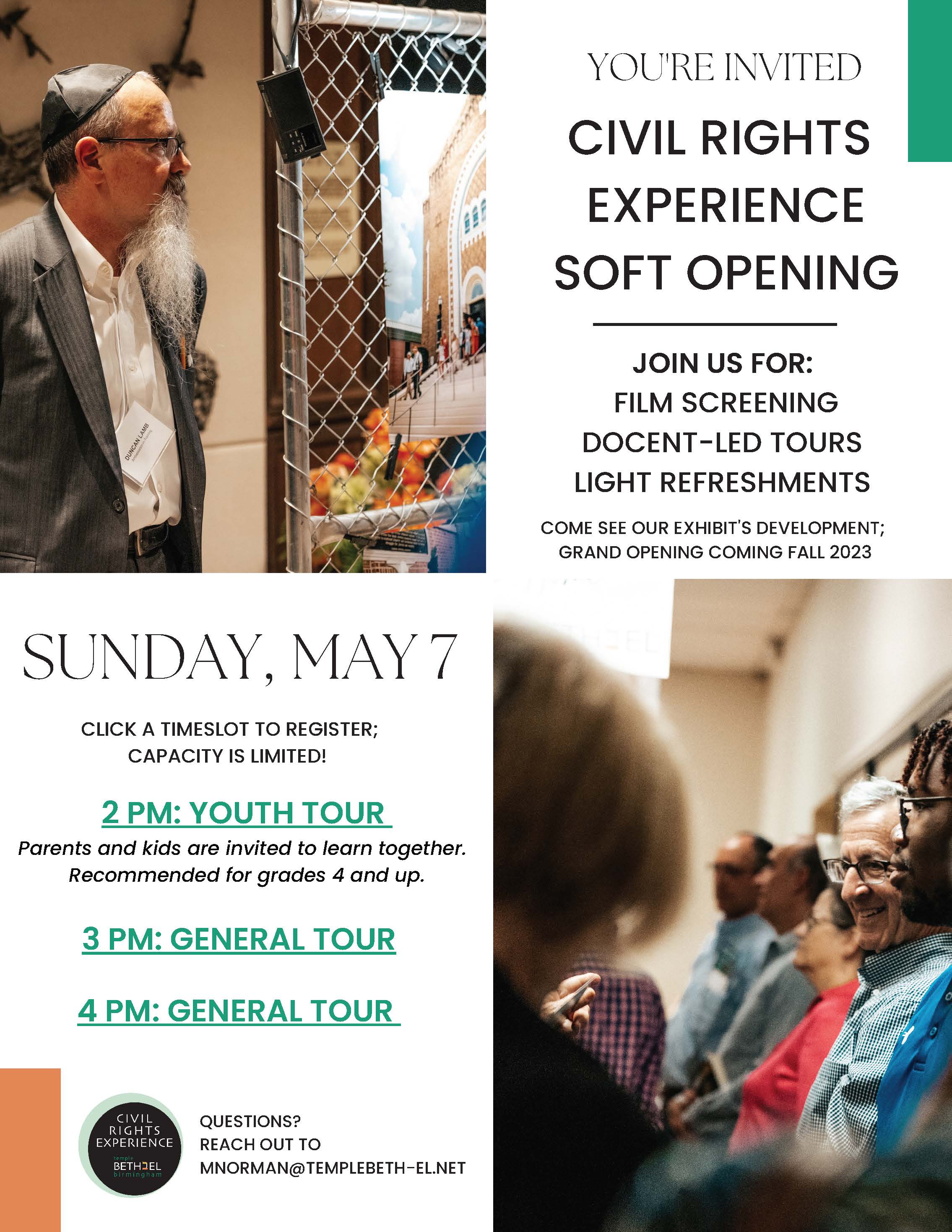 This is the soft opening of Temple Beth-El's Civil Rights Experience, which explores Birmingham’s civil rights history through the lens of the city's Jewish community and builds connections to foster ongoing acts of tikkun olam (repairing the world). The experience will open permanently in the fall of 2023.